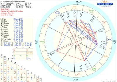 O sextil de Plutão á Lua e a Neptuno denuncia qua na base deste governo há uma grande crise nacional, financeira  e que afecta toda a sociedade. Este aspecto obriga à revelação de todos os podres e facilita os esforços de regeneração. No entanto, os maus aspectos de Plutão, em particular a Mercúrio e ao Sol deste governo podem vir a por em causa a existência mesmo desse governo, limitando a sua acção por receio da queda do poder. Plutão faz ainda trígono a Jupiter, um aspecto normalmente associado a riquezas escondidas, enterradas, recursos mineiros e outas metáforas ou exemplos para boas surpresas no plano material. Como Jupiter rege a VII dos parceiros e a IV do território nacional, talvez o socorro venha ou dum parceiro rico com petroleo ou finalmente da descoberta do dito em solo pátrio.