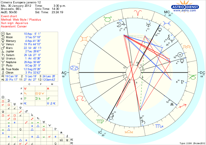 Hoje é dia de Cimeira Europeia. Em Bruxelas reunem-se os Chefes de Estado e governo da União Europeia, simbolizados pela conjunção do Sol e Mercúrio em Aquário, ou seja, comunicação entre os poderes colectivos sobre os interesses do grupo a que pertencem. A oportunidade de encontrarem soluções inovadoras para resolver as questões que partilham é marcada pelo sextil do Sol e Mercúrio a Urano em Carneiro mas a aproximação de uma quadratura de Urano a Plutão em Capricórnio é sinal de potenciais rupturas por divergências sobre novos caminhos e ainda a sujeição a grande contestação por parte do eleitorado, a avançar em crescendo até um primeiro extremo de tensão na Cimeira de Junho próximo.