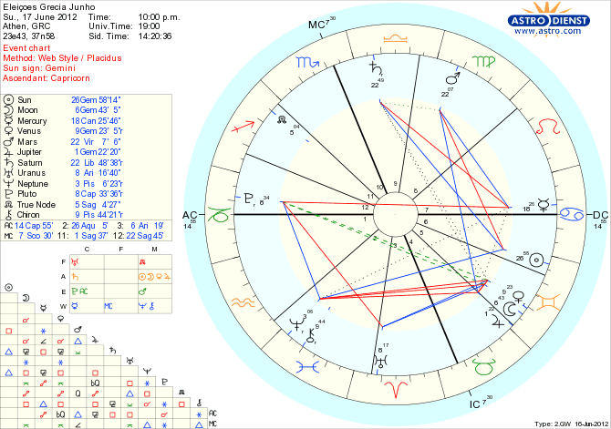 É a presença do Sol, Vénus, Lua e Júpiter – o poder, o dinheiro, a opinião pública e as leis terrenas ou religiosas- no signo dos Gémeos que faz com que todos estes assuntos sejam dificilmente dissociáveis e garante a ambivalência, opções múltiplas e natural instabilidade e rapidez na sucessão de eventos. Sendo os Gémeos regidos por Mercúrio e estando este em Caranguejo, as vozes defendem a segurança pessoal, nacional, os interesses pátrios. Com Mercúrio oposto a Plutão em Capricórnio, esse ego ou nacional-centrismo está em conflito com as forças de controlo das estruturas gerais e dívidas e hipotecas públicas ou privadas.