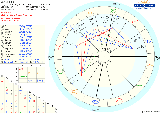A intuição é forte e está alinhada com a capacidade de mover montanhas. Assim, é mais fácil hoje conciliar sonho e realidade e transmitir ou produzir algo iluminado ou sensível, enquadrado na obrigação de transformar os valores materiais ou espirituais a que nos agarramos. Tudo isto porque a Lua está em Peixes, em trígono primeiro a Saturno e de seguida ao Nódulo Norte em Escorpião e Vénus avança para a conjunção a Plutão. É esta conjunção a Plutão – que rege dívidas, hipotecas e tudo o que é partilhado, desde o sexo até á morte, – com Vénus, – o planeta das relações amorosas ou financeiras, – que domina a semana até que haja uma transformação de poder daquilo que valorizamos. É preciso não esquecer que Vénus está a ativar a quadratura de Urano a Plutão que ate 2015 pontua as transformações do sistema financeiro global e das relações dos países do Euro em particular e que Plutão caminha para a conjunção ao Sol dos horóscopos da adesão da Grécia, Portugal, da moeda única e de outros horóscopos do processo europeu. Daí que seja de antever nova agitação e mais um passo nas transformações do sistema.