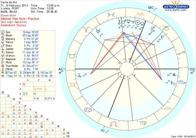 Resolver dificuldades antigas nas relações pessoais ou financeiras torna-se assim mais provável, com a ajuda ainda do semi-sextil de Vénus a Quíron em Peixes. Não só a Irlanda está a conseguir uma restruturação histórica da sua dívida financeira como em Bruxelas os dirigentes europeus têm na mesa o orçamento da União pra os próximos anos. Os trânsitos do dia não são suficientes para levar o empreendimento a bom termo, mas a entrada da Lua em Aquário pelo final do dia vai certamente facilitar o diálogo coletivo e a reforçar a inquietação sobre as consequências gerais de um desacordo.