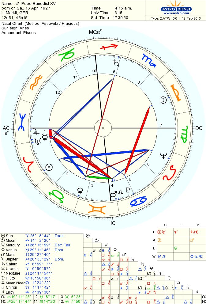 O Papa Benedict XVI renunciou no dia 11 de Fevereiro ao seu cargo de chefe da Igreja Católica que abandonará no dia 28 deste mês. Alegou motivos de saude, com Neptuno e Vénus em transito na XII trígonos ao Nódulo Norte na IV, Mercúrio e Lua conjuntos ao Ascendente, Marte quadrado a Saturno e conjunto a Júpiter no dia 28 em que deixa o cargo em simultâneo com Júpiter oposto a Saturno e o Sol, vital e regente da saude em trânsito na XII todo o mês de Fevereiro até 10 de Março.