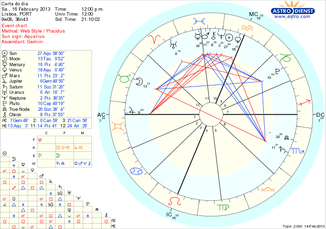 O entusiasmo pode fraquejar pela manhã, GMT, com a Lua em Touro oposta a Saturno apesar do trígono a Plutão e sextil a Marte que forçam mesmo a atenção sobre tais restruturações. Pela tarde, a Lua faz quadratura a Vénus em Aquário e sextil a Mercúrio em Peixes: os contactos sociais podem ser factor de tensão mas a aposta num diálogo sensível ameniza o conflito interior entre o relacionamento eclético em grupo definido por essa Vénus e a necessidade íntima de relações seguras pedida pela Lua em Touro.