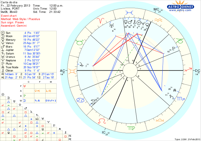 Aparentemente o discurso que usamos ou as iniciativas que tomamos não reflecte tais obsessões que nos possam estar a roer. Com Mercúrio, Marte, Sol e Neptuno em Peixes, tanta água dilui exteriormente pressão da quadratura de Urano e Plutão, ajudando a fazer as reformas necessárias através de uma discurso suavizado por Mercúrio em Peixes em trígono ao Nódulo Norte em Escorpião. Mas a Lua em Caranguejo é o sinal claro da vulnerabilidade e desejo de segurança emocional baseada nas raízes sólidas num passado que já não existe. Amanhã a Lua estará em Leão e o protagonismo será outro…
