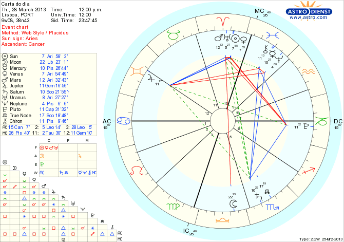 Com Sol, Vénus e Urano conjuntos em Carneiro as novidades e excitação não vai faltar. A dificuldade maior do dia e deste final de mês é o controlo da mania das grandezas, não só pelo aspecto de Mercúrio a Marte mas também porque Júpiter está em quincúncio a Plutão: o razoável seria reconhecermos os nossos limites e não pretendermos ser o que não podemos ser. Talvez a Coreia se acalme…. ou não….
