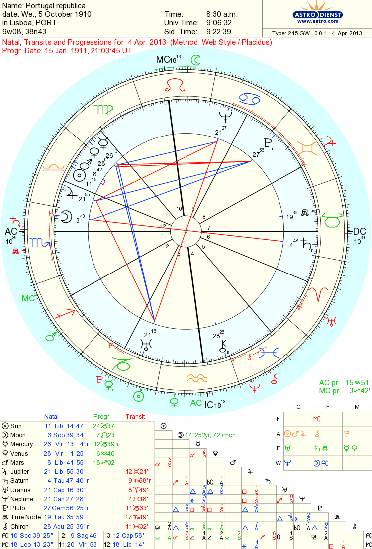 O horóscopo da instauração da República em Portugal a 5 de Outubro de 1910 é extraordinariamente representativo,-  tanto pelos aspectos que contem como pelos trânsitos que se sucedem,  – da evolução da situação política no país desde 1910. Sabia-se que tinha sido pelas 9 da manhã mas a hora exacta foi encontrada num manuscrito inédito de Fernando Pessoa que o astrólogo Luís Resina desencantou nos Reservados da Biblioteca nacional e que depois rectificou para as 8.30 e analisou.  Muitos já fizeram interpretações várias do tema, mas dado o momento actual de crise e potencial transformação das estruturas políticas e financeiras, é bom olharmos novamente para o passado para melhor entendermos o que se pode esperar a curto e médio prazo, dos trânsitos potentes em curso dos planetas lentos, aos planetas natais desse horóscopo.