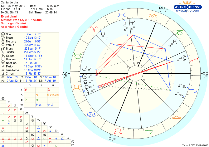 Seja a passear, seja em contactos pessoais, encontros, conversas, debates, a manifestar opiniões e crenças, hoje domina a hipersensibilidade, a inconsequência, extravagância ou excessos com a Lua em Sagitário oposta a Vénus, Mercúrio em Júpiter em Gémeos. As perturbações pela palavra ou movimento são acompanhadas por acções bruscas, decisões repentinas ou erráticas com Marte em Touro em semi-quadratura a Urano em Carneiro. Gera-se a confusão ou estamos mesmo iludidos nas nossas convicções com a quadratura do Sol em Gémeos a Neptuno em Peixes. No entanto somos chamados à realidade e talvez até reprimidos nas manifestações excessivas pelo quincúncio de Mercúrio e Vénus a Saturno em Escorpião que mostra quem tem o poder e quem não tem.