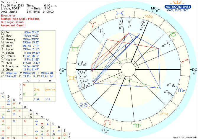 É possível hoje explicarmos um ponto de vista diferente que sirva os interesses do grupo ou mundo em que nos inserimos. O importante é que as propostas originais possam encontrar eco no colectivo ou sejam a resposta que é necessária aos males de que padeça esse mesmo colectivo. O Sol em Gémeos sextil a Urano em Carneiro e a Lua em Aquário trígono ao Sol são os dois aspectos que contribuem para a importância da clarificação de posições que quebrem os impasses, neste momento charneira pontuado pela quadratura de Urano a Plutão.