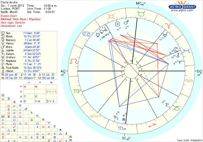 Em resumo, um bom fim de semana para começarmos por descansar e nos distrairmos antes de lançarmos mãos á obra ou tomarmos iniciativas que nos permitam sair de impasses e em que a chave está em podermos comunicar mais livremente as soluções que preconizamos para que o nosso mundo pessoal ou o mundo à nossa volta encontre novas bases de segurança. Só é preciso ter cuidado com fantasias mas estas não devem ser graves já que Saturno está em trânsito lento em trígono a Neptuno, estabilizando e dando oportunidade de concretizar ideais, desde que sirvam, a longo prazo, propósitos comuns.