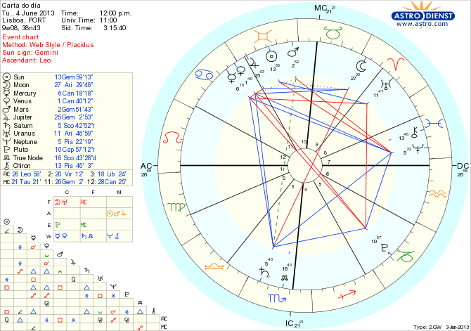 A acrescentar às tensões do dia temos o Sol em Gémeos em quadratura a Quíron em Peixes o que dificulta a capacidade de exprimirmos as nossas ideias de forma a que sejam ententidas como mensagens de paz e harmonia. Marte em Gémeos em semi-quadratura a Urano em Carneiro é de facto o catalizador desta tensão porque nos pode levar à agressividade verbal e a vocalização egoísta de racíocínios ambivalentes.