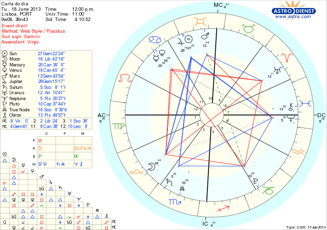 São muitas as oportunidades hoje e amanhã de fazermos contactos, combinarmos programas, partirmos de viagem ou simplesmente estarmos optimistas e expandirmos os nossos horizontes físicos ou intelectuais. É o Sol e Júpiter que se aproximam de uma conjunção anual, desta vez em Gémeos e hoje a Lua em Balança faz um trígono a esses dois planetas e reagir de forma equilibrada tendo em conta os interesses de todas as partes em qualquer negociação ou procura de acordo. No entanto, a Lua faz também uma quadratura a Vénus e a Júpiter em Caranguejo o que implica que não deixa de haver tensão porque questões domésticas ou nacionais, contabilidades ou inseguranças complicam as relações, principalmente as que tinham já sido sobressaltadas ontem pela tarde ou hoje de manhã pela quadratura da Lua a Plutão em Capricórnio e oposição a Urano em Carneiro.