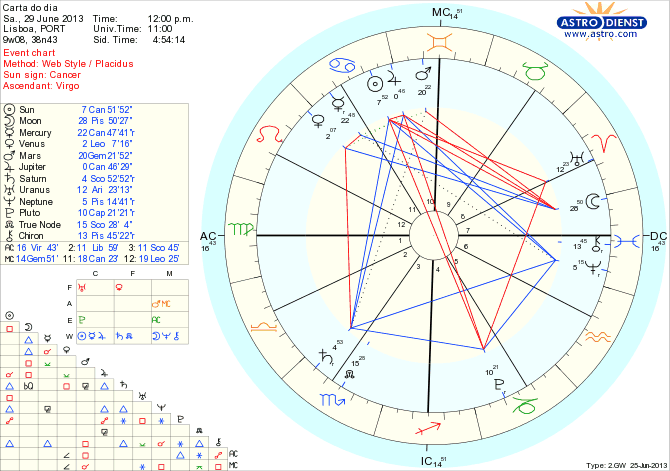 Como pano de fundo temos um grande triângulo de Água com Sol e Júpiter em Caranguejo em trígono a Neptuno em Peixes e Saturno em Escorpião o que nos coloca no plano da sensibilidade, carência, fantasia e necessidade de partilha. Por cima disto temos, na primeira metade do dia a Lua em Peixes a absorver todas as impressões que nos rodeiam excitando susceptibilidades, e pela tarde e noite, a Lua em Carneiro exige acção, quer excitação, não olha a restrições e tudo se torna ainda mais intenso porque a Lua faz um trígono a Vénus em Leão e uma quadratura a Júpiter. Resultado, nada é frio, tudo escalda e é preciso cabeça fria para minimizar as potenciais consequências dos excessos, na madrugada e amanhã quando a Lua activar a quadratura de Urano a Plutão, fazendo conjunção a Urano.
