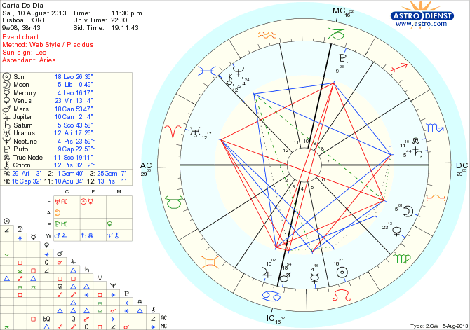 O importante hoje é manter relações equilibradas, procurar soluções conjuntas e prepararmo-nos para o que der e vier. A presença da Lua em Balança, em vésperas de activar a quadratura de Urano a Plutão é o motor da busca de estabilidade mas outros aspectos dinâmicos animam o dia. Em primeiro lugar é preciso dar atenção ao Sol e a Mercúrio em Leão que tendem a dramatizar a energia vital e s contactos estimulando as exigências do ego e posições individualistas. No entanto, um contraparalelo do Sol ao Nódulo Norte em Escorpião mostra que não podemos ser o centro das atenções e temos que partilhar o que de mais profundo temos, seja a nivel material ou espiritual, entregando-nos ao destino, ao mesmo tempo que um quincúncio de Mercúrio a Neptuno em Peixes pede atenção ao que dizemos – e ao que nos dizem- para não passarmos mensagens enganadoras nem sermos enganados por qualquer confusão. Mais ainda, um contraparalelo de Mercúrio a Plutão em Capricórnio força irmos ao fundo das questões fazendo da frontalidade e da entrega emocional as chaves da tranquilidade.