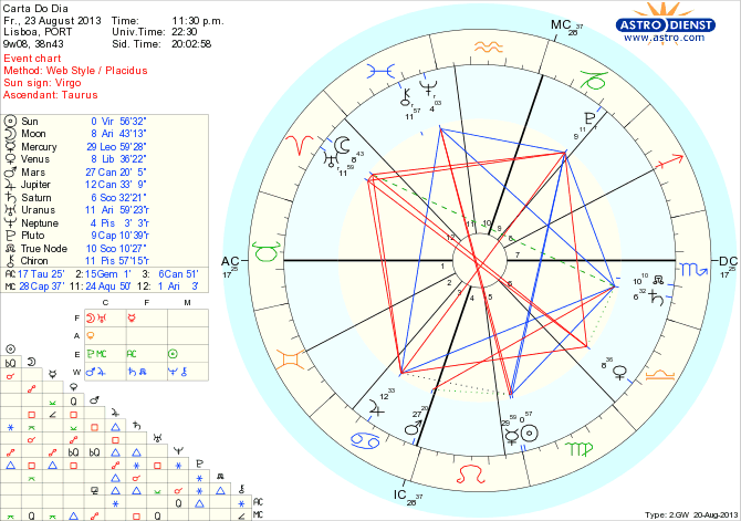 Hoje é um dia complexo em que por um lado queremos ir atrás dos impulsos de mudança mas por outro sabemos que temos de fazer contas, analisar todos os detalhes e não nos precipitarmos. Sabemos que o mais complicado está para vir já que há que definir novas relações pessoais e financeiras e os revezes de fortuna são inevitáveis. Deve-se isto, por ordem de influência, a presença da Lua em Carneiro quadrada a Plutão, conjunta a Urano e oposta a Vénus, à entrada de Mercúrio e do Sol no signo da Virgem e à activação da quadratura de Urano a Plutão por Vénus em Balança, desde ontem e até dia 27 de Agosto. Neste período as crises políticas e financeiras em curso estão exaberbadas.