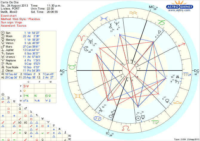 Com Marte e Lua em recepção mútua, ou seja, com Marte em trânsito num signo regido pela Lua e esta em trânsito num signo regido por Marte, ambos em quadratura exacta pela tarde GMT, ofensas e defesas, agressividade, passividade agressiva, provocações e reações intempestivas são o que pede o instinto mas que há que saber controlar. Com o Sol e Mercúrio conjuntos em Virgem a arrogância mental é outro risco. O ideal é conscientemente tomarmos iniciativas bem pensadas que sirvam os interesses das família ou do país.