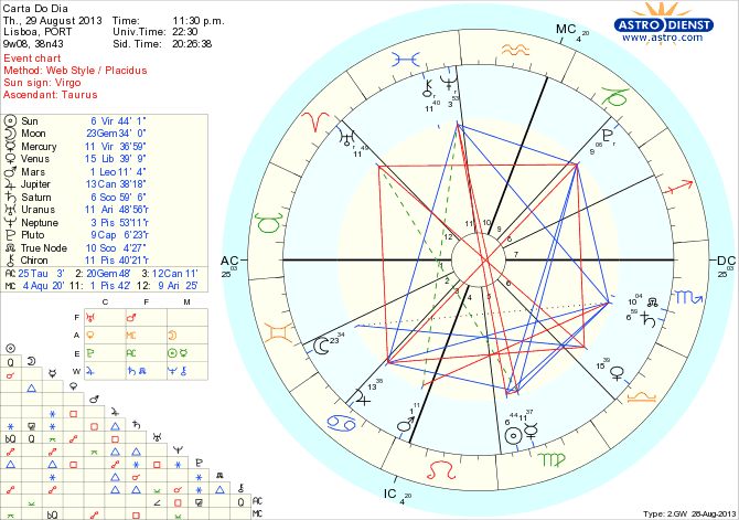 É muito difícil chegar hoje a conclusões e o melhor é aproveitar o dia para recolher opiniões, investigar assuntos, comunicar as dúvidas ou simplesmente fazer contactos. Em causa estão questões de organização do bem estar geral cuja discussão revela vulnerabilidades e sombras e há que estar pronto para abordagens inesperadas ou soluções inovadoras. Deve-se isto a presença da Lua em Gémeos em trígono a Vénus em Balança em recepção mútua com Mercúrio em Virgem oposto a Quíron em peixes e quincúncio a Urano em Carneiro.