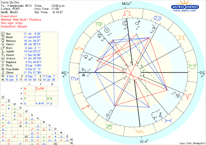 O melhor hoje é não reagir a provocações, nem procurar ser compreendido. O que há a fazer é ouvir os outros e tentar entender as suas posições ao mesmo tempo que procuramos entender as nossas próprias motivações. Se não for assim pode ser explosivo apesar de tudo se limitar à discussão entre o meio-cheio e o meio-vazio. Deve-se isto ao quincúncio exacto entre o Sol em Virgem e Urano em Carneiro ao mesmo tempo que a Lua transita Leão em sextil a Vénus em Balança. Marte em Leão aproxima-se durante toda a semana de uma quadratura a Saturno e ao Nódulo Norte em Balança o que nos dá já sinais de que há que refrear grandes afirmações dramáticas e estar preparado para nos ajustarmos à realidade, à necessidade de fazer planos a longo prazo e a sujeitarmo-nos a imperativos externos para levarmos por diante os objectivos ajustados e que neste caso são os que impliquem a reformulação de poderes, de bens partilhados e de tudo que represente uma acção transformadora, de guerra, paz ou contabilidades não passíveis de abordar individualmente. O bi-quintil de Marte a Quíron em Peixes garante que a criatividade e abertura são as chaves que curam todas as feridas e abrem as portas para a acção.