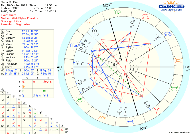 Temos de aproveitar até à hora de almoço, GMT, para levarmos por diante os projectos em curso, sem perder tempo, mas há que ter a certeza que são sólidos e que não estamos a ver tudo com lentes cor-de-rosa. Três aspectos contribuem para isto: por um lado temos a Lua em Sagitário em trígono a Marte em Leão que anima iniciativas e concretizações mas por outro lado temos Vénus em Sagitário em sesquiquadrado a Júpiter em Caranguejo em em quadratura exacta a Neptuno o que estimula optimismo e a procura de satisfação a par com tendência para excessos, ilusões e muito pouco sentido prático. Muito rapidamente somos chamados à realidade e à necessidade de nos apoiarmos em estruturas concretas para não cair na boca do dragão. A Lua, pela tarde, entra em Capricórnio e prepara-se para amanhã quinta feira activar a quadratura de Urano a Plutão arrastando-nos outra vez para o mundo das crises em curso, pessoais ou colectivas e a obrigatoriedade de nos despojarmos do que não está certo, nem tem futuro. A complicação de hoje reside em termos de encontrar um equilíbrio entre a vontade inflamada, o coração encantado e a razão a exigir transformações cuidadas e profundas, a longo prazo, com Mercúrio, Saturno e o Nódulo Norte conjuntos em Escorpião. Com o Sol em Balança em quadratura nos próximos dias a Júpiter em Caranguejo atenção também a não desperdiçarmos energias com quem não interessa.