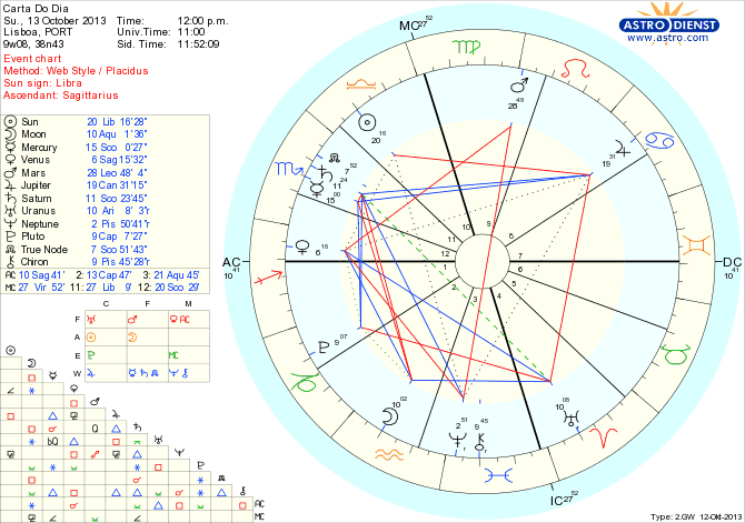 Há que encarar as dificuldades, assumir responsabilidades e procurar uma solução original que satisfaça os interesses futuros do colectivo. Em causa está a reorganização de poderes, dívidas ou bens partilhados, assuntos que têm mesmo que ser resolvidos indo ao fundo dos problemas e encontrando novas estruturas para os enquadrar, através de uma acção racional e do díalogo. Isto porque Saturno está em Escorpião em conjunção a Mercúrio e ao Nódulo Norte. A quadratura da Lua em Aquário, hoje, a esse stelium em Escorpião, e em sextil a Urano é o que nos faz mostra friamente as dificuldades que há que ultrapassar em conjunto e a possibilidade de solução original. É preciso não esquecer o contexto em que todos estes aspectos se fazem sentir e que é o da quadratura de Urano a Plutão que até 2015 há de pontuar transformações profundas da organização financeira e de estruturas de poder, pessoal e colectivo, ao mesmo tempo que o Sol em Balança nos põe perante o dilema da justiça e do equilíbrio nas relações pessoais, políticas e contabilisticas e Júpiter em Caranguejo, em trígono ao Sol e biquintil a Vénus em Sagitário nos estimula reações excessivas na defesa das questões familiares ou nacionais ancoradas apostas ideológicas ou filósóficas, noções de verdade únicas mas confusas porque Vénus está em quadratura a Neptuno em Peixes e numa quadratura larga a Marte em Leão. Em resumo, não há entusiasmo nem princípios gerais que hoje nos aliviem do confronto com uma realidade dura, que é a do nosso lugar na sociedade.