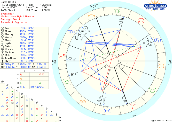 Os sentimentos estão hoje alinhados com a razão ou vontade e todos os sonhos parecem possíveis. Fantasia, criatividade, satisfação do coração e da alma estão na ordem do dia e o optimismo domina as emoções. Conseguimos ter mais segurança pessoal, expandir as bases em que nos apoiamos, apostar na casa, família ou país e, cuidadosa mas confiantemente, fazer o que for preciso para re-organizar as estruturas partilhadas. Obras em casa, renegociação de hipotecas, renovação ou re-decoração doméstica são exemplos simples de actividades favorecidas hoje. Mas também podemos ir mais longe no aprofundamento do que espiritualmente nos alimenta ou através da educação, cultura ou religião regenerarmos formas de vida. O Sol em Escorpião em trígono a Neptuno em Peixes levanta as barreiras que nos impediam de renascer, o sextil de Marte em Virgem garante a atenção aos detalhes, a Lua conjunta em Júpiter em Caranguejo favorece o plano íntimo ou doméstico e as inseguranças são transformadas em diálogo profundo e acção construtiva graças ao trígono a Mercúrio e a Saturno em Escorpião.