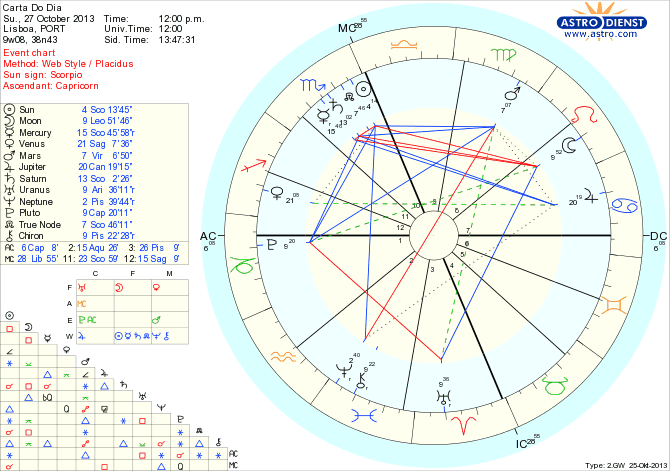 Encarar a realidade, perceber do que é que temos andado a fugir ou temos acatado apesar da contrariedade ou insatisfação é a tarefa de hoje seguida de iniciativa própria para dar a volta ao assunto. Não é dia para fazer compromissos nem por a cabeça na areia. O contraparalelo de Urano a Quíron em Peixes é o aspecto que nos faz ver a verdade das feridas fundas, que revela a dor do inconsciente, fase a partir da qual só temos um caminho que é o que a Lua nos permite hoje: dizer eu não quero, eu quero, eu mudo o que não estava bem. Com a Lua em Leão em trígono a Urano em Carneiro e em quincúncio a Plutão em Capricórnio há que declarar claramente o que sentimos, o território que consideramos nosso e a independência da acção. Está claro que isto tem um preço e neste caso vai ser a resposta fria da autoridade, das estruturas que nos dominam, do peso das responsabilidades colectivas. A Lua pelo final da tarde faz quadratura a Saturno e a Mercúrio em Escorpião e as reações à libertação não são de aplauso…. é importante escolher bem as palavras de ordem para não perdermos o argumento. O caminho é o da regeneração criativa e financeira com o o Sol em Escorpião, conjunto ao Nódulo, sextil a Plutão e trígono a Neptuno.