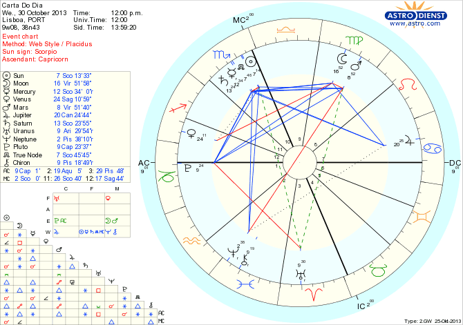 Não podemos pensar no dia de hoje isoladamente no resto da semana. Os próximos três dias são fundamentais para redefinirmos situações, determinarmos rumos, decidirmos o que é nosso e o que é dos outros, o que partilhamos ou o que retiramos do que tinhamos em comum. É tempo de lidar com verdades escondidas, segredos revelados, fazer contas, restruturar valores, orçamentos ou dívidas ou, se as preocupações não forem apenas do quadro dos poderes pessoais ou financeiros, aprofundarmos o que de transcendente nos une, o nosso destino colectivo e como nele participamos, fisica e espiritualmente. Algo tem que morrer para que haja futuro, não estivessemos também no outono….mas desde hoje, estamos praticamente na quadratura exacta de Urano a Plutão que culmina dia 1 e o Sol faz conjunção ao Nódulo Norte em Escorpião enquanto Marte e a Lua transitam a Virgem. Mercúrio, regente da Virgem está retrogrado conjunto a Saturno em Escorpião. É esta combinação de aspectos que resulta no quadro acima descrito enquanto Marte oposto a Quíron em Peixes põe a nu todas as desgraças e descontentamentos, velhas feridas e falta de solidaderiedade colectiva. E afinal controlamos o quê?