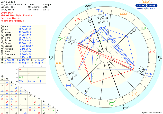 É pela manhã GMT que as tensões são maiores. Com a intuição à flor da pele procuramos respostas para medos ou carências e acabamos por perceber que há que ir mais fundo na transformação das estruturas de pensamento, organização e segurança, abandonar velhos hábitos e enfrentar as mudanças com abertura. Mal damos esse salto, tudo muda. Depois da Lua em Caranguejo fazer trígono ao Nódulo Norte em Escorpião e activar a quadratura de Urano a Plutão, pela tarde faz conjunção a Júpiter e trígonos sucessivos a Mercúrio e a Saturno também em Escorpião, até sexta-feira, em que faz trígono ao Sol no último grau antes de este entrar em Sagitário. Ou seja, hoje é o dia para finalizar o ciclo de mudanças profundas que começou com a entrada do Sol em Escorpião a 23 de Outubro e vamos fechá-lo com chave de ouro, arrumando mais uma etapa das questões de bens ou poderes partilhados, dívidas e dependências e passando a concentrarmo-nos num quadro teórico, nos príncípios regentes, nas ideias que nos orientem e dêm novos horizontes para prosseguir o lento caminho de transformação que até 2015 há de mudar radicalmente o modo de operar tanto doméstica como colectivamente com a mudança de mão de poderes, riquezas e sentido do que nos transcende.