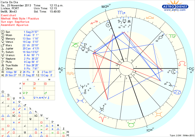 Entramos no fim de semana a pensar que vai ser de sonho ou apenas sem problemas de maior e não escondemos os sentimentos nem o entusiasmo pela vida. Também não somos superficiais e procuramos estabilidade emocional. É a Lua em Leão, apaixonada e criativa, dramática, orgulhosa e sensível que nos leva a querer ser o centro de todas as atenções. Avançamos sem conflito interior para a demonstração pública de que o pensamos ou queremos corresponde à nossa essência, com o trígono da Lua ao Sol em Sagitário. O que se vê é o que é – e a harmonia interna é o motor deste aspecto que é complementado por um trígono da Lua a Urano em Carneiro- que permite maior espontaneidade e uma quadratura do Sol a Neptuno em Peixes- que favorece fantasias, paixões e metafísica mas também nos pode deixar sem saber bem qual é o sentido final para além do que podemos dar aos outros.