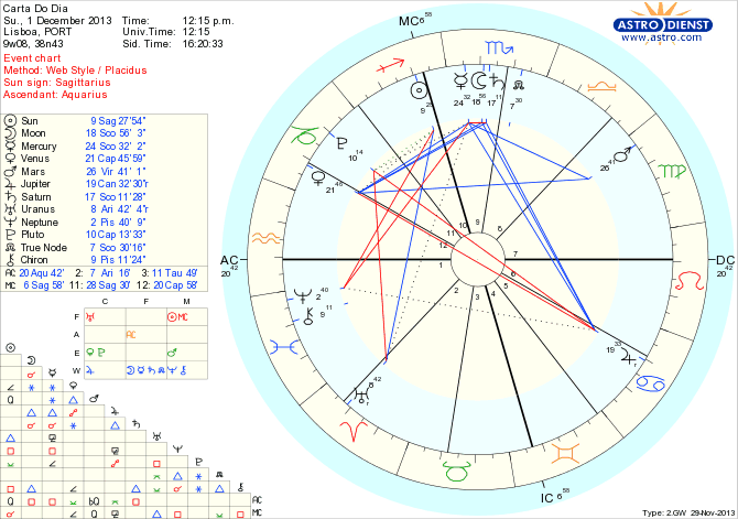Tal como ontem estamos hoje sujeitos a aprofundar experiências, estabelecer contactos transformadores, revelar o que estiver escondido tanto material como psiquicamente, incluindo forças interiores desconhecidas. Podemos ir mais longe e com isso criar novos padrões se conseguirmos evitar ficarmo-nos pelo azedume ou cinismo de quem tudo entende mas não faz nada para mudar. É a presença de Mercúrio em Escorpião em semiquadratura a Plutão a Capricórnio que torna a mente e a informação em poderosas armas de mudança. Em simultâneo, um semi-sextil a Plutão pelo Sol em Sagitário traz-nos as oportunidades para nos recriarmos estruturalmente, encontrarmos nova liberdade de movimento e ideias, viajarmos no conhecimento e com isso sermos capazes, de intensamente, como em tudo que envolve Plutão, renascermos das cinzas e prepararmos o novo ciclo da Lua Nova na noite de segunda para terça. Ainda não podemos revelar tudo nem abrir mão completamente da necessidade de controlo porque a Lua ainda está hoje amanhã em Escorpião mas a conjunção a Saturno e o trígono, hoje pela tarde GMT, a Júpiter em Caranguejo dá-nos a responsabilidade e segurança para prosseguir no caminho de transformação.
