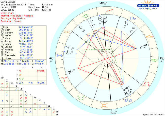 As emoções estão estáveis e é em casa ou na defesa dos interesses familiares, domésticos ou nacionais que apostamos com toda a força. É nessas áreas que queremos melhorar as condições de vida e temos a possibilidade de estruturar dívidas e distribuição de responsabilidades ou organização. A Lua em Caranguejo faz conjunção a Júpiter e trígono a Saturno em Escorpião o que até para pedir empréstimos para obras ou melhoramentos é bom. A intuição e sensibilidade também estão amplificadas mas fazemos delas uma boa gestão. A razão ou lado mental também são estimulados pelos aspectos de quincúncio a Júpiter e quintil a Neptuno que desde ontem Mercúrio em Sagitário activa. Isto permite-nos dizer o que é preciso para atingir esses objectivos de expansão, com inteligência, optimismo e clareza, desde que saibamos distinguir o real do imaginário e se não prometermos mais do que podemos oferecer.