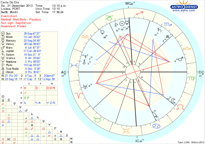 Hoje é o solstício de Inverno, o dia mais curto do ano no hemisfério Norte, marcado pela entrada do Sol no signo do Capricórnio. É tempo de pesar bem as estruturas em que estamos inseridos, familiares, sociais e políticas, assumir responsabilidades, estar atento às tradições e pensar a longo prazo. Em simultâneo, hoje e até ao final de Janeiro, Vénus, símbolo das relações ou acordos pessoais e financeiros, deusa do amor e dos prazeres entra retrógrada no último grau de Capricórnio. Temos assim pela frente seis semanas para rever a ordem que programamos nessas áreas relacionais, repensar acordos e valores, seja no amor, nas finanças ou no poder. A introspeção é fundamental para podermos libertarmo-nos de limites do passado e apostar em novas estruturas. Para ajudar esse processo que nos obriga a ir á raíz das questões, hoje Vénus faz um paralelo a Plutão em Capricórnio e a exigência de renascer das cinzas vai aos seus limites. As pulsões de controlo, vitimização, manipulação e toda a panóplia de respostas passionais seja nas finanças, dívidas, ou envolvimentos amorosos surgem intempestivas e há que abrir mão, aceitar que as situações têm de ser revistas para dar lugar ao novo em mais um dos ciclos sucessivos de transformação que até 2015 vão pontuar a vida pessoal e colectiva. Marte em Balança, regida por Vénus incita a redefinir equilíbrios mas apesar da abordagem ser a mais diplomática possível os confrontos ou rupturas são inevitáveis até ao final do ano com Marte a fazer oposição a Urano e quadratura Plutão. Atenção, calma e cuidado são palavras chave para passar o melhor possível a quadra festiva.
