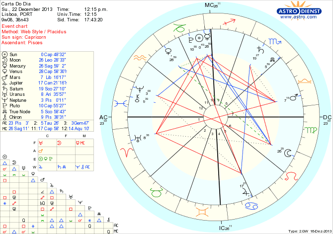 Numa primeira fase do dia o entusiasmo por ideias criativas, novos horizontes, viagens do corpo e da mente domina as emoções mas, pela tarde GMT, apesar de continuarmos com a razão e o coração em sintonia, o que perdemos em fogosidade ganhamos em solidez com base no sentido crítico e na organização das tarefas. A Lua começa por, em Leão, fazer um belo trígono a Mercúrio em Sagitário mas pelo final do dia entra em Virgem e faz trígono ao Sol acabado de ingressar em Capricórnio. É nas estruturas familiares ou colectivas, tradições e obrigações saturninas que a nossa energia se aplica mas fazemo-lo agora de corpo e alma, escolhendo cuidadosamente como gerir tudo e todos. Este aspecto seria sensacional para não falhar detalhes não fosse a Lua fazer também no final do dia uma oposição a Neptuno em Peixes. Assim tudo se suaviza ou dissipa, o romance ou qualquer estado alterado de consciência sobrepõe-se à razoabilidade e entregamo-nos às situações amorosamente. Os excessos de álcool, droga, um filme fantástico, música envolvente, uma experiência mística, paixão à primeira vista são vários dos indicadores de que nos queremos escapar à realidade. A clareza de propósito é recomendável e Marte em Balança a aproximar-se da activação da quadratura de Urano a Plutão mostra-nos a necessidade de pôr nova ordem nas relações, de preferência com ideias claras.