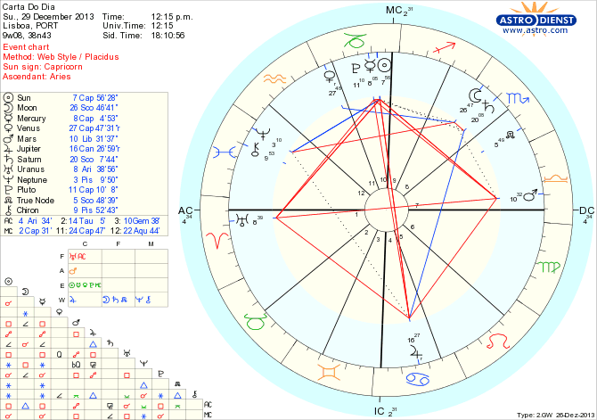 Os pensamentos são erráticos, a lógica pervertida e correm-se riscos apesar da vontade de criar uma nova ordem que perdure, mesmo que isso obrigue a aniquilar adversários ou parceiros. Isto acontece hoje com Mercúrio conjunto ao Sol em Capricórnio quadrado a Urano em Carneiro e Marte em Balança a avançar para uma quadratura exacta a Plutão em Capricórnio para qual se aproximam também Sol e Mercúrio em conjunção, num climax na Lua nova do primeiro dia do ano.