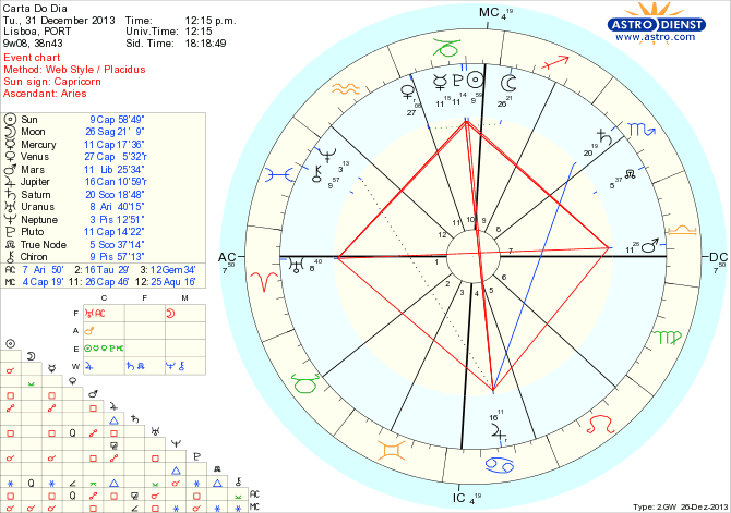 O ano acaba em grande tensão para quem não levar a sério promessas, cuidados e a verdade das coisas. Em vésperas da Lua Nova de Capricórnio que calha no primeiro dia do ano todo o Céu se concentra em quadraturas dífíceis excepto um trígono largo de Júpiter em Caranguejo a Saturno em Escorpião, o tal que pede respeito pelos compromissos em nome na segurança.