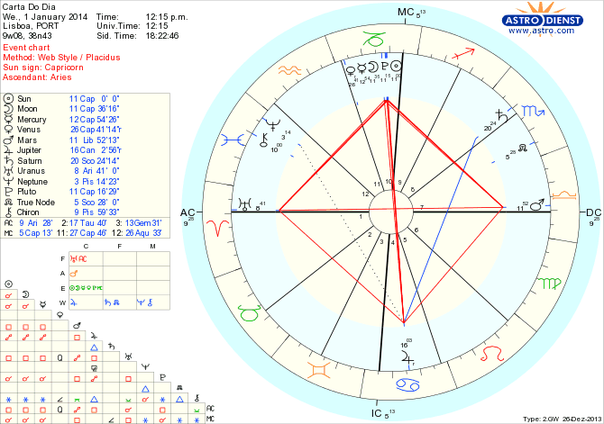 Só acontece de 19 em 19 anos e este 1 de Janeiro é um desses dias raros em que o primeiro dia do ano coincide com uma Lua Nova no ambicioso signo do Capricórnio. Arrancamos o ano conscientes de que estamos a começar não só um ano novo mas um ciclo novo com mudanças profundas, mais responsabilidades e a necessidade de deixar para trás velhos hábitos, tradições, dependências, organização de vida, dívidas ou encargos que se tornaram incomportáveis. Isto não aconteceu de repente, tem vindo a desenvolver-se através de um crescendo de tensões e conquistas nos últimos dois anos e todo 2014 será dedicado a tornarmos viáveis as sementes, projectos ou sonhos hoje estabelecidos. – PARA O RESTO DO ANO VER AS PREVISÔES NOS ARTIGOS FIXOS DO BLOG.