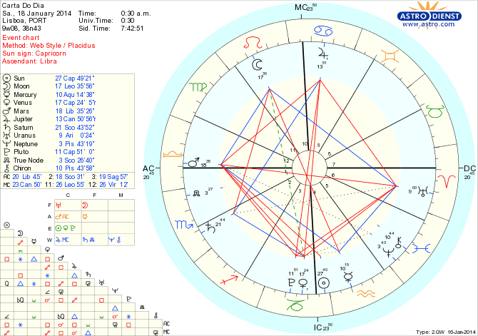 É preciso avaliar bem as situações e encará-las frontalmente apesar da passividade, fantasias ou rejeição latentes. Hoje, por um lado estamos prontos a dramatizar, levar tudo a título pessoal e exigir atenção com a Lua em Leão em trígono a Urano em Carneiro e sextil a Marte em Balança, mas um sesquiquadrado de Marte a Neptuno em Peixes faz-nos vacilar, usar da passividade como agressão ou simplesmente ter mais dificuldade em atingir os objectivos pretendidos. Como Mercúrio em Aquário está em semi-sextil a Plutão em Capricórnio, há que ir ao fundo das questões, explorando informação que a todos abranja, contactos e o lado sombra do colectivo, dependências e poderes para fazer uma avaliação mais correcta do que está em jogo e sobre o qual temos de decidir. A Lua, pela tarde, em quadratura a Saturno em Escorpião indica que vamos ter de ser menos egoístas e procurar soluções de compromisso.