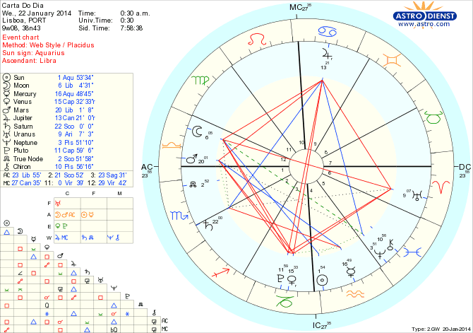 Hoje é um dia importante em que temos de encarar, em termos individuais ou colectivos, como nos queremos afirmar no mundo, tendo em conta as transformações profundas em curso e as que há ainda que fazer. O Sol em Aquário está em quadratura desde ontem e até amanhã ao Nódulo Norte em Escorpião, o que nos diz que é tempo de deixar para trás velhos padrões de dependência ou controlo emocional e financeiro e a Lua em Balança, em trígono ao Sol e oposição a Urano em Carneiro põe-nos em sintonia com essa nova projeção no futuro através de novos contactos e abandono de antigas relações que já não têm lugar no quadro agora a ser criado. A Lua activa hoje a quadratura de Urano a Plutão e, ao final do dia, custe o que custar, estamos a dar mais um passo evolutivo transformando os padrões de relacionamento e as estruturas em que estávamos apoiados.