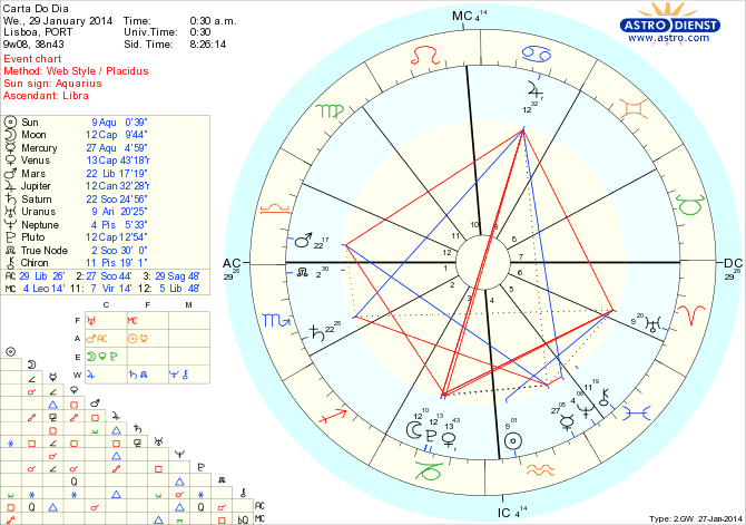Não falta energia nem oportunidades hoje para pormos em marcha o que há que mudar e que tem impacto colectivo ou na nossa inserção em grupo. Soltar amarras, transformar as bases em que estamos inseridos e apostar em novos padrões de poder e segurança são hoje favorecidos em primeiro lugar pelo sextil do Sol em Aquário a Urano em Carneiro – que estimula revolução e evolução – e de seguida pela conjunção da Lua a Plutão e a Vénus, em Capricórnio, e oposição a Júpiter em Caranguejo – que nos força a levar por diante alteração de dependências, dívidas, organização estrutural, poderes e relações estagnados e finanças duvidosas para nos estabelecermos segundo outros princípios. Um semi-sextil de Marte em Balança a Saturno em Escorpião ajuda a encontrar novos equilíbrios nas relações pessoais e financeiras e dá a maturidade necessária para que apesar das mudanças haja respeito por limites condicionantes. Um paralelo de Mercúrio ao Nódulo Norte, também em Escorpião, ilustra a importância dos contactos sociais e comunicação para atingirmos os objectivos de mudança. As dificuldades vêm de um sesquiquadrado de Mercúrio a Júpiter que estimula exageros que não trazem bons resultados e de de uma semi-quadratura de Mercúrio a Vénus que cria tensão entre a necessidade de ordem e a defesa de liberdades. Não nos podemos esquecer que toda a semana Júpiter está em oposição a Plutão e a Vénus , o que são aspectos gerais de grandes reviravoltas políticas e financeiras que afectam regimes, moedas e mercados em termos colectivos e em termos pessoais influenciam mudanças de e em casa, na organização do trabalho e nas gestão financeira.