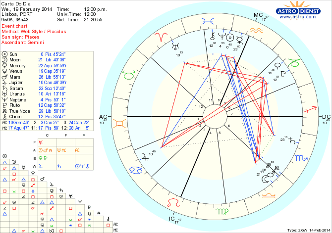 Entre a franqueza e a reserva, entre o sonho e a realidade, entre a projecção e os limites, temos hoje de encontrar o compromisso ideal. Tudo começa com a necessidade de fazer a paz, ouvir o outro, calar a vontade, respeitar a lei associadas ao trânsito da Lua em Balança, mas esta faz conjunção a Marte depois de almoço GMT, sobe a mostarda ao nariz e queremos agir, mudar o equilíbrio das relações, cortar certo laços e procurar nova forma de garantir a justiça, tal como a sentimos no âmago. Mas não é só no âmago que exigimos o respeito dos sentimentos. Com o Sol a entrar em Peixes em trígono ao Nódulo Norte no último grau de Balança, a Água das emoções e fantasias, sonhos e ideais que nos movem agora também tem de encontrar uma saída equilíbrada através dos relacionamentos. Ambicionamos outras estruturas em que assentar os pilares das nossas vidas com Vénus regente de Balança em trânsito em Capricórnio e continuamos a repensar o nosso lugar no mundo com Mercúrio retrógrado em Aquário. Mas Saturno em Escorpião em quadratura a Mercúrio mostra que antes de andar em frente é preciso pagar e resolver dívidas e encargos, poderes e dependências que nos limitam o futuro. O que não for re-equilibrado hoje vai tornar-se amanhã, com a entrada da Lua em Escorprião, fonte de sentimentos intensos- o que não for hoje a bem, amanhã sentimos que só pode ir a mal…
