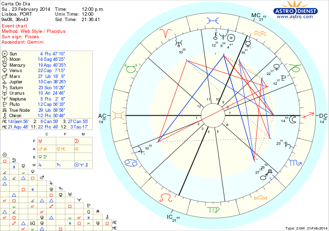 Há um sonho e uma vontade mas é difícil concretizar o que quer que seja. Podemos ter uma visão de um mundo ideal, querermos criar qualquer coisa ou simplesmente ver um filme que nos inspire estética, emocional ou espiritualmente a ser mais justos ou fazermos coisas mais belas ou equilibrarmos poderes ou contas. Mas por ser domingo, os astros não ajudarem ou qualquer outra razão, é a fantasia que comanda o dia e o melhor é aproveitar. O Sol está conjunto a Neptuno em Peixes a estimular-nos visões de mundos ideais enquanto a Lua em Sagitário nos pede para abrirmos horizontes de conhecimento, filosofia, viagens, sabedorias. Marte conjunto ao Nódulo Norte em Balança exige novas abordagens nas relações mas um trígono lato ao Sol e a Neptuno é o que não deixa as ideias passar da mente para o papel. Vamos divagar hoje já que não há mais nada a fazer….