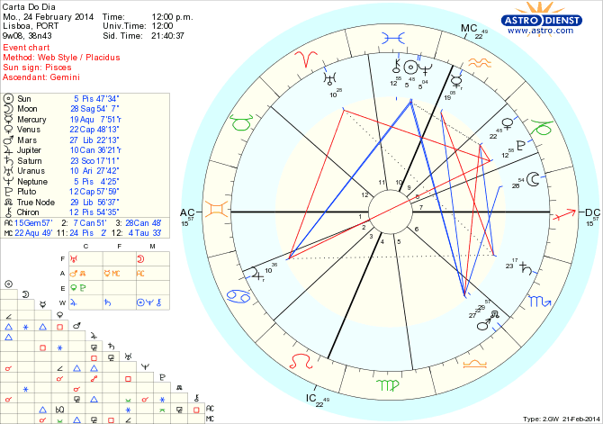 É pela tarde GMT que temos de voltar a concentrar-nos na realidade depois da evasão do fim-de-semana. Fazemos o que é preciso pondo-nos de acordo com parceiros, sócios ou em qualquer negociação mas não podemos exigir demasiado e temos de encontrar o equilíbrio entre o desejo de iniciativa ou de acção imediata e a necessidade de atingir objectivos a longo prazo. O que estimula isto é em primeiro lugar a passagem da Lua de Sagitário para Capricórnio e, de seguida, a conjunção hoje e nos próximos dias de Marte ao Nódulo Norte em Balança em quadratura a Vénus em Capricórnio. As reações vão mesmo ser controladas e o sentido de responsabilidade conjunta ou colectiva impera graças a um sextil de Vénus a Saturno em Escorpião. Sem lugar para a espontaneidade, mas com o apoio de quem pode mais, conseguimos hoje pequenos avanços na preparação das próximas etapas. Mercúrio ainda está retrógrado em Aquário e temos até ao final do mês para arrumarmos assuntos gerais sobre as estruturas em que nos inserimos e como queremos ver organizadas, de futuro as nossas vidas.
