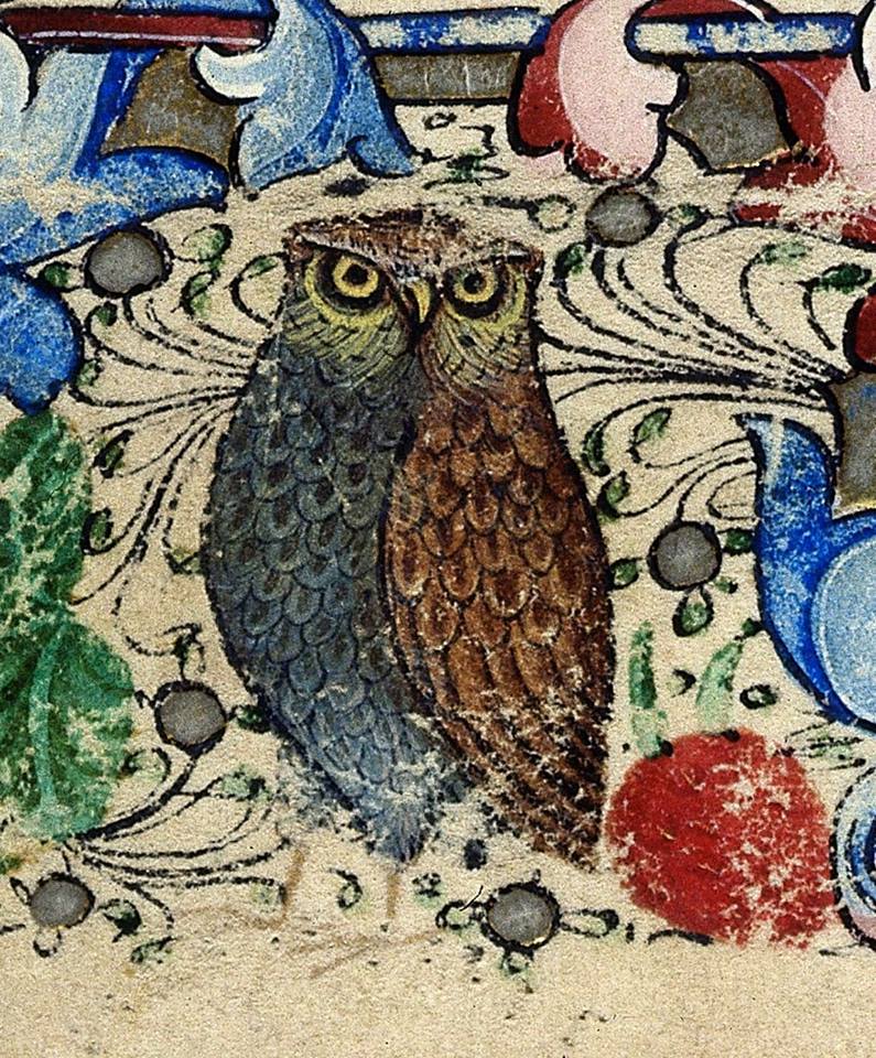 A imagem é o ” Mocho”, iluminura “Gufo”, do ‘Libro d’Ore del conte di Ormond’ (1460 circa), British Library, Londres.