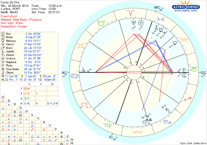 Vão ser muitas e complexas as interações pessoais e colectivas hoje estimuladas por esses aspectos que são o prenúncio das tensões maiores que se avizinham em Abril. Os pontos hoje tocados pela Lua simbolizam ou sublinham as fraquezas que têm de ser resolvidas com mudanças de paradigmas, custe o que custar, e que o Sol vai acelerar quando, a 1, 2 e 3 de Abril fizer conjunção a Urano e quadratura a Plutão e Júpiter.  Com um eclipse dia 15 de Abril e todo o mês que vem com Urano, Plutão em Júpiter em quadraturas exactas e ainda outro eclipse a 29 de Abril, em todos os quadrantes pessoais, políticos, financeiros e sociais, nas crises em curso no Médio Oriente, na Ucrânia, no sistema financeiro internacional e em particular nos horóscopos de Putin, da Ucrânia, da Nato, dos EUA e em todos os outros que têm igualmente planetas entre os 10 e 15 graus dos signos cardinais, é de esperar confronto com a necessidade de evolução e transformação de velhos hábitos, poderes e dependências.  Se nasceu por volta do dia 3 de Abril, 6 de Julho, 7 de Outubro ou 4 de Janeiro, ou se o seu ascendente, Lua, ou qualquer outro planeta se encontrar em redor dos 13 graus prepara-se para deixar para trás o que lhe impede prosseguir caminho- abraçe a mudança e aceite ou construa as  suas novas circunstâncias.