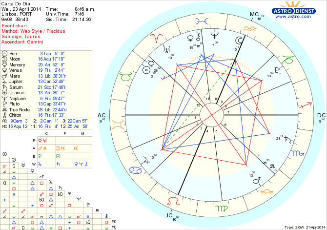 Como a Lua hoje transita o Aquário em semi-sextil a Urano, quincúncio a Júpiter, trígono a Marte e quadratura a Saturno, todas as aspirações de liberdade, relacionamentos colectivos, projecção de futuro, ideais de sociedade estão sujeitos a empolgamentos e repressão. Há que integrar soluções criativas simbolizadas pelo Leão no eixo de Aquário, para que as manifestações façam sentido e não esquecer que com o Nódulo Norte em Balança, as coisas só se resolvem mesmo com diálogo e concertação.