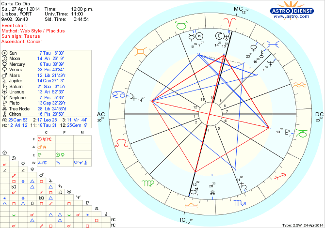 Estamos a dois dias de um eclipse do Sol em Touro, o que significa fim e princípio de circunstâncias relacionadas com a nossa segurança material ou territorial e temos já hoje a Lua a impulsionar essas mudanças. Em trânsito pelo Carneiro, a Lua vai hoje accionar a grande cruz de Abril em conjunção a Urano a estimular as acções impetuosas, em oposição a Marte retrógrado em Balança a provocar as disputas, em quadratura a Plutão em Capricórnio numa enorme tensão de transformação profunda das estruturas que nos regem, seja em família, seja no trabalho, na política ou em qualquer situação de poder ou dependência pessoal, financeiro ou do âmbito colectivo, em quadratura a Júpiter em Caranguejo, a exagerar as respostas instintivas de defesa do ninho ou da nação. É, por isto tudo, mais um dia chave nas crises em curso seja na política ou finanças internacionais seja nas vidas dos que têm planetas no seu horóscopo na órbita dos 13 graus dos signos cardinais. Face a tanta agitação é preciso ir buscar alento ou inspiração a qualquer lado e essa fonte está no sextil do Sol em Touro a Neptuno em Peixes. O Sol simboliza as forças do ego, a energia vital e em Touro agarra-nos cuidadosa e teimosamente a tudo o que nos garanta bem estar e segurança material. Neptuno é o planeta etéreo, da consciência colectiva, da espiritualidade, sonho e fantasias de fusão solidária, universal ou toxicodependente. O sextil entre ambos representa oportunidades de concretizarmos os nossos ideais ou basearmos as nossas práticas em motivos ilusórios ou de consciência. A conjunção de Mercúrio ao Sol e sextil também a Neptuno faz-nos querer explicar a lógica das opções e o que lhes está subjacente e dá a empatia que permite ver os vários lados das questões- mas nada disto trava os motores de mudança em marcha, apenas o justifica.