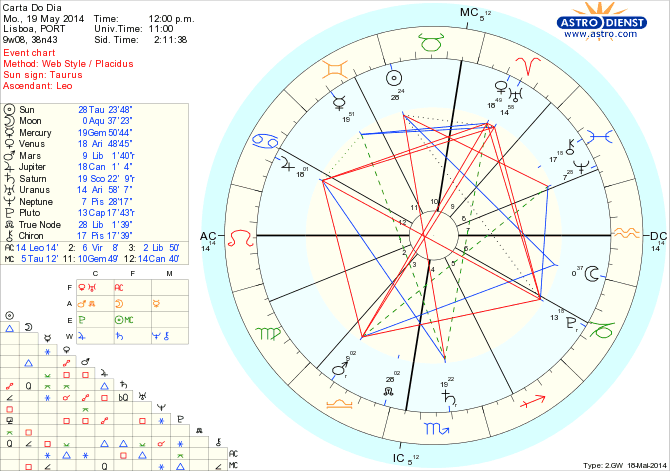 Estamos a acabar de aprontar questões materiais que há um mês constituem o foco das nossas preocupações e conseguimos hoje fazer saber ao mundo quais os projectos e o tipo de acordos que pretendemos discutir. O Sol está nos últimos graus de Touro onde temos que teimosamente defender os nossos valores materiais ou garantir retornos e para tal, como a Lua entra em Aquário há que sair da rotina, encontrar novas abordagens conceptuais e pensar de uma forma menos individualista, o que vai facilitar entendimentos já que a Lua faz trígono a Marte em Balança. Vão ser mesmo necessárias soluções originais e que satisfaçam todas as partes porque Vénus em Carneiro está em quincúncio a Saturno em Escorpião o que começa por causar frustração mas daí deriva vir a luz que traz novas oportunidades que resolvam a obrigatoriedade saturnina de re-estruturar os bens materiais, finanças ou poderes de forma a sentirmos maior segurança, tal como pede o trígono de Saturno a Júpiter. A comunicação é chave com Mercúrio também em quincúncio a Saturno e sextil a Vénus.
