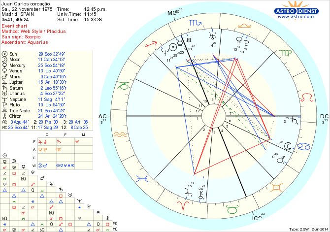 Doente e depois de vários escândalos pessoais e familiares na manhã do dia 2 de Junho o Juan Carlos formaliza junto do primeiro ministro Rajoy a abdicação que planeava há um ano. Estamos em plena quadratura de Urano a Plutão com Jupiter em Marte numa grande cruz desde Abril. Tempos de mudança de poderes e de paradigmas. Este momento reflecte no ceu natal sobre o Sol do rei que recebe já a quadratura de Urano em trânsito na XII e a oposição de Júpiter para além de Saturno estar na cúspide da VII. Estes são apenas alguns aspectos do que merece um estudo aprofundado e cronológico.
