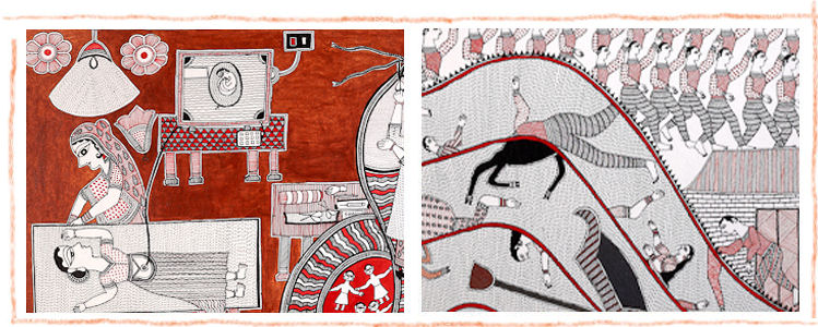 O desenho de hoje é um mural do interior de uma casa em Mithila, em Bihar no Norte da India, onde há a tradição desde o sec XIV de as mulheres pintarem nas paredes e muros cenas do quotidiano familiar e colectivo.