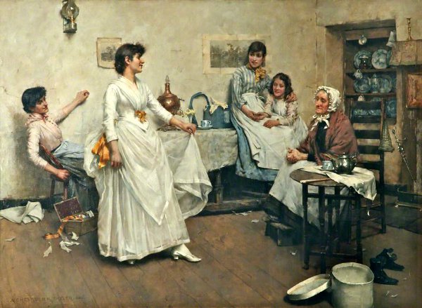 A tela é do pintor inglês Albert Chevallier Tayler, chama-se ” A prova do vestido” , é de 1888 e está no museu de Liverpool.