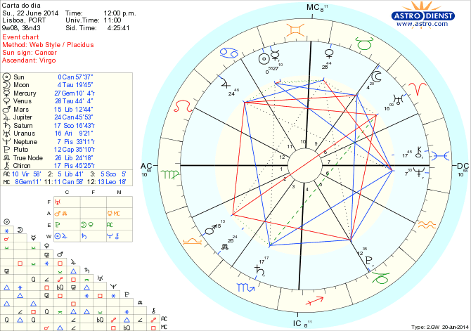 Como pano de fundo está Marte em Balança em oposição a Urano em Carneiro há já uns dias e exacto hoje e amanhã, a assinalar esse virar de página nas relações pessoais, financeiras, diplomáticas ou jurídicas. Neste contexto, Vénus regente de Balança, em trânsito pelo Touro e em sextil a Júpiter em Caranguejo pede concretização e expansão do bem estar familiar, doméstico, nacional, o que é corroborado por uma Lua em Touro em sextil ao Sol em Caranguejo, sextil a Neptuno em Peixes e trígono a Plutão em Capricórnio que teimosamente nos faz procurar levar a bom termo todas as obras necessárias para alcançarmos a segurança base sonhada. Com Mercúrio ainda retrógrado e agora em Gémeos, é através das comunicações, negociações e contactos a recuperar que o processo pode evoluir.